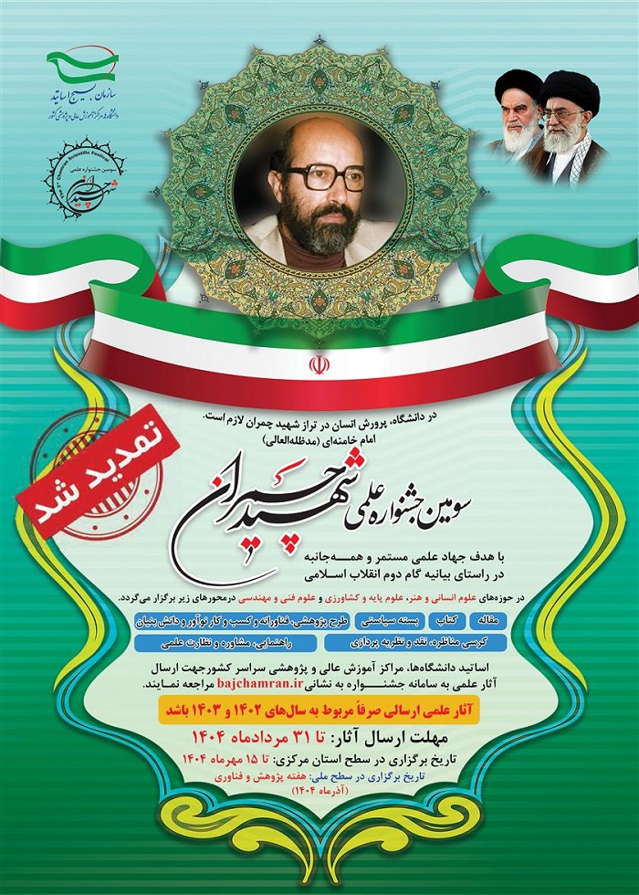 به اطلاع اعضای هیئت علمی و اساتید مدعو می رساند، سومین جشنواره دو سالانه علمی شهید چمران، با هدف اصلی ترویج و تعمیق علمی مستمر و همه جانبه، در راستای تحقق اهداف بیانیه گام دوم انقلاب اسلامی، در شش محور 1 - کتاب 2 - مقاله 3 - طرح های پژوهشی و فناورانه و کسب و کار نوآور 4 - راهنمایی، مشاوره، نظارت و راهبری پایان نامه ها، رساله ها و پروژه ها 5 - بسته سیاستی  6 - کرسی نظریه پردازی نقد و مناظره، به منظور ارج نهادن و اهمیت بخشیدن به نقش برجسته و تلاش نهضت استادی بسیج و نیز تمامی استادان دانشگاه ها و مراکز آموزش عالی و پژوهشی استان در سال 1404 توسط سازمان بسیج اساتید برگزار می شود و مهلت ارسال آثار تا پایان مردادماه تمدید گردیده است.