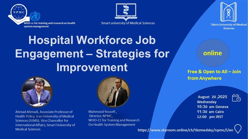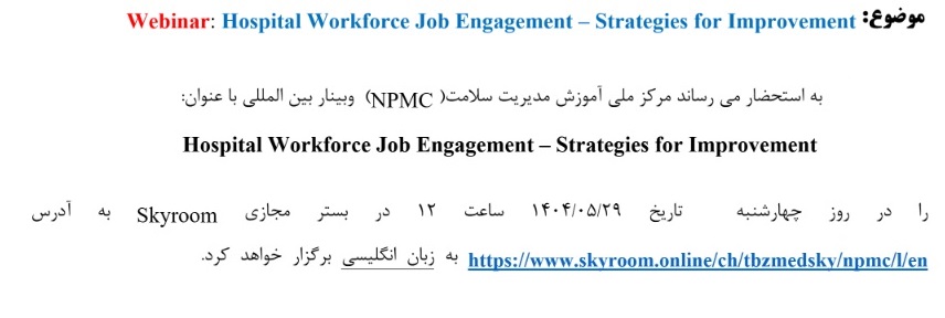 وبینار آموزشی بین المللی Hospital Workforce Job Engagement – Strategies for Improvement ۲۹ مرداد ۱۴۰۴ | ۱۰:۰۱ کد : ۵۳۹۲۵ اطلاعیه ارسال به دیگران نام شما ایمیل شما ایمیل دریافتکننده ارسال انصراف تعداد بازدید:۱۷۴۲ وبینار آموزشی بین المللی Hospital Workforce Job Engagement – Strategies for Improvement