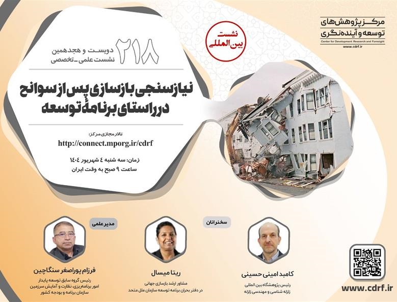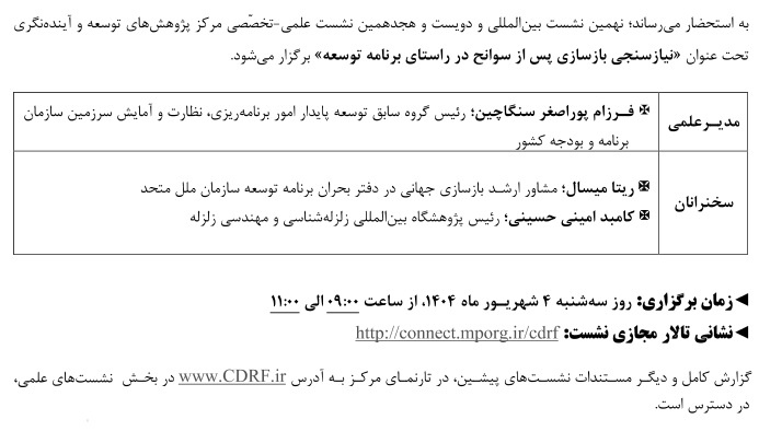 نشست علمی نیاز سنجی بازسازی سوانح در راستای برنامه توسعه ۰۳ شهریور ۱۴۰۴ | ۱۲:۳۷ کد : ۵۴۰۰۰ اطلاعیه ارسال به دیگران نام شما ایمیل شما ایمیل دریافتکننده ارسال انصراف تعداد بازدید:۱۵۹۰ نشست علمی نیاز سنجی بازسازی سوانح در راستای برنامه توسعه، توسط مرکز پژوهش های توسعه و آینده نگری برگزار می گردد.